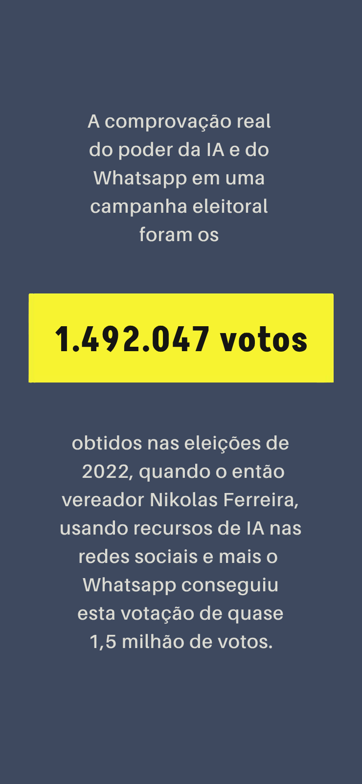 A solução é a WhatsVoto.IA que é uma plataforma digital formada por ferramentas digitais e uma estratégia principal idealizada por Steve Bannon, mentor estratégico de Trump, Netanyahu, Bolsonaro, entre outros líderes da direita e copiada com sucesso por Biden, Lula, Macron, etc.
